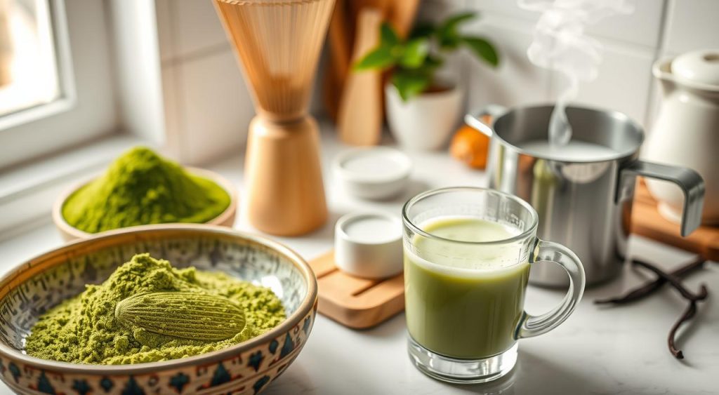 The base of a great matcha latte is high-quality matcha powder. Choose culinary-grade matcha for the best taste and color. Mix it with hot water to get it just right. You can add sweeteners like organic cane sugar or honey for a natural sweetness.